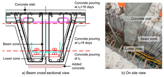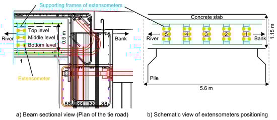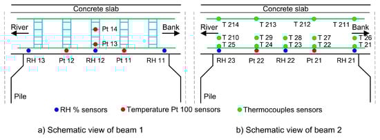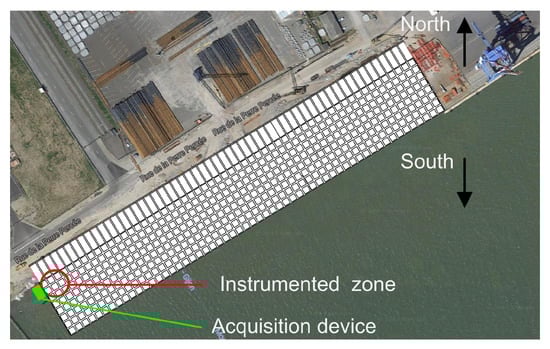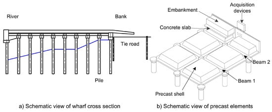 The structural elements of the wharf called “beams” are delimited by the volumes between the prefabricated shells. Reinforcements are installed in this volume and then it is filled with concrete during the construction phase. Two structural elements located at the end of the platform are equipped with sensors (see Figure 1b and Figure 3).