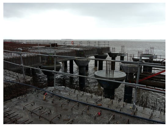 The multi-sensor instrumentation presented here falls within the framework of the project iMARECO2 (french acronym for Monitoring for Maintenance, Reassessment and Optimal Design). It is a project approved by the Sea Innovation Cluster and managed by Keops Automation. The other partners are Université de Nantes, Nantes—Saint Nazaire Port and Bouygues Construction. It relies on the monitoring of the “Grand Quai” (main wharf) during its construction commissioned by Nantes—Saint Nazaire Port (Nantes—Saint Nazaire harbor, France). This has been built as an extension of an existing wharf at Montoir de Bretagne on the Loire estuary. The benefits of this project are multiple. First of all, the instrumentation will be used to optimize maintenance procedures. The real-time monitoring is generally of interest for the owner. In the long term, he can expect substantial costs saving in maintenance and a lifespan extension of the structure using relevant data for its decision support tools [6]. Secondly, the use of measurements during the construction stage could help the construction company to improve its building procedures. For the owner, the structural monitoring at early age associated with materials testing is useful to assess the actual performance of the structure delivered and its initial state (and not those of the specifications). Last, the instrumentation contributes to experience feedback. It should be emphasized that on pile wharf is a rare and prototype structure placed in complex environment generating multiple zones of degradation which causes additional costs as compared to conventional structures. During the design stage, the additional costs are generated by the lack of knowledge of several effects (environmental for example) and because construction standards do not take into account combined pathologies. After construction, additional maintenance costs are related to the difficulty of inspection, the complexity of the pathologies and the lack of experience feedback. In this context, there is a real need for experience feedback to optimize the operating costs including the cost of the measurement chain. Some studies [5,7,8,9,10] already contributed to this task but none took into account the benefit of the measurement performed at early age and during the first months of service life as it is done here in the framework of concrete coastal structures. The article presents the data provided by the measurement chain to monitor the structure at early age, evaluate its performance and monitor the evolution of concrete. Some sensors installed on the structure to detect long-term disorders are also sensitive to changes in the concrete occurring during the first months. These data are discussed and compared with the results of tests carried out on concrete in laboratory which allows to identify the most relevant methods and data for manufacturing monitoring.
