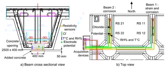 The two beams in the instrumented zone are equipped with a multi-sensor system for monitoring chloride ion penetration and ageing according to the drawings in Figure 4.