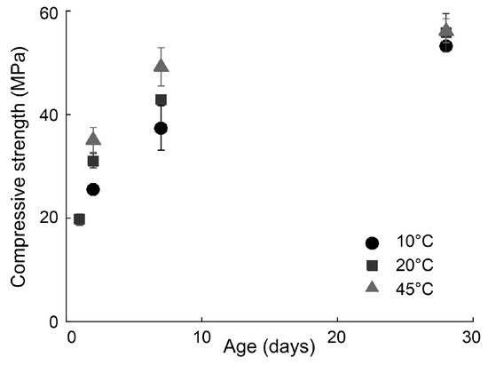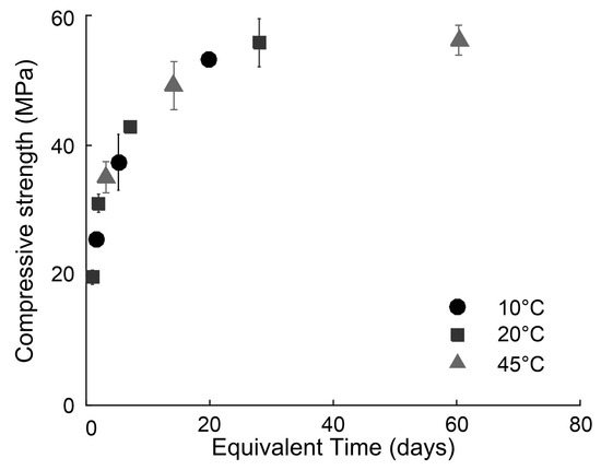 where is the equivalent age at reference temperature (days), is the apparent activation energy [J/mol], R is the gas constant 8.314 J/mol·K and T is the average absolute temperature of concrete [K]. is often referred to as “apparent activation” energy as hydration is the combination of several physical and chemical phenomena overlapping in time, thus it does not show a constant value [30,31]. However, for defined ranges of hydration degrees (or strengths) it can be assessed as a single value. In this study the apparent activation energy was determined using the method of superposition which consists in adjusting the value of activation energy , through Equations (7) and (8), in order to superpose the evolutions with time of the compressive strengths measured at 10 C and 45 C with the reference evolution over an interval . The value of has been calculated by the method of least squares in order to provide the best overlap of the data sets corresponding to the three testing temperatures.