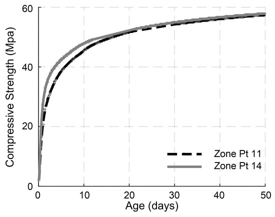 Significant temperature gradients are likely to be generated in the studied beam due to dimensions of cross section of the wharf structural elements [27]. Early-age thermal cracks result from either differential expansion within a concrete element during heating causing internal restraint or by external restraint due to contraction during cooling stage. The main parameters involved in early age thermal cracking, i.e., strength, modulus, shrinkage, and creep, depend on concrete temperature history. Maturity method [18] allows estimating the properties of concrete from the measured temperature evolution of in-place concrete and laboratory tests in controlled conditions. This method is based on the measurements performed at different times of the compressive strength of the samples stored at different temperature (see Section 2.6.2). First, the evolution of the compressive strength of the samples stored at 20 C is fitted with a function adapted from the mathematical expression given in Eurocode 2: