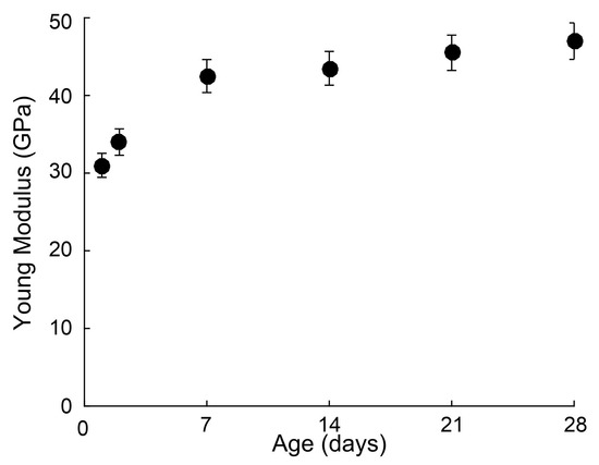 The compressive strength was assessed after 1, 2, 7, and 28 days on the specimens stored in water at different temperatures. Three specimens for each storage temperature were tested at each age. A non-destructive method based on the frequency of vibration was used to monitor the evolution of elastic properties on the set of specimens stored at 20 C. The natural frequencies of the concrete cylinders were measured with the Grindosonic equipment. The elastic modulus E was deduced by using the Spinner and Tefft model [22].