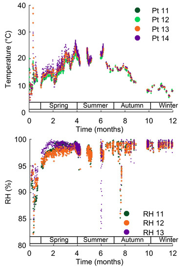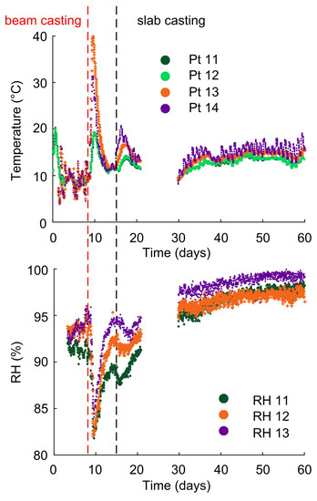 The Pt 100 probes and thermocouple sensors have been calibrated in temperature chambers. Humidity sensors were placed in temperature chambers in sealed containers containing saturated saline solutions according to standard [16]. The resistivity sensors were calibrated in a homogeneous medium including the actual reinforcement bars (see Figure 5) as described in Section 3.2.