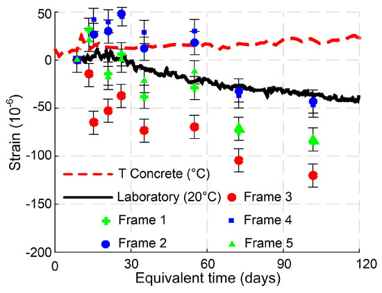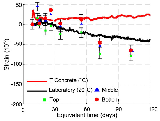 The value of K is given by the sensor supplier in the calibration report. According to Ferdinand [24], K. It has been evaluated by thermal calibration for each sensor. In addition to the strain measurements, strain-free FBGs are positioned between top and middle levels (see Figure 6) to ensure thermal compensation of the system. During the first days, the relevant information that can be calculated using these extensometers is the shrinkage of the concrete at the core of the structure. It is calculated from the Equation (4) knowing the thermal dilatation coefficient of the concrete (with C)