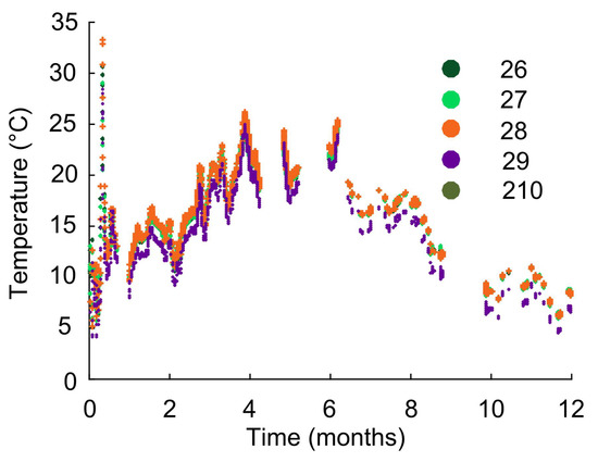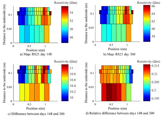 The resistivity measurement provides another illustration. In the scientific literature, a threshold value is retained as an indicator of corrosion. The probability of initiation of corrosion is considered high for a value of 100 ·m [13]. Within the wharf, on a new structure, and after several months of measurement, the resistivity is still below this threshold. As explained above, since concrete is not very porous, only a high water content of the material, due to the location of the structure (on the riverside) can explain this measure. To have relevant information on the evolution of the corrosion risk and to be able to detect the progress of the chloride front in a particular area, the exploitable information is the relative difference between two states [53], i.e., between two pseudo sections of apparent resistivity as presented in Figure 19. If this relative difference shows a decreasing resistivity value near the surface of the structure, one possible conclusion is that it is caused by the penetration of a chloride front. A strong correlation was observed between increased resistivity and mechanical strength. The study of Liu et al. [54] actually showed that after the de-percolation time of capillary pores, the resistivity of cement paste is controlled by the volume fraction of C–S–H, which is also the main hydration product for its contribution to mechanical strength. The measurement of resistivity could thus be used as part of material monitoring. The “ageing factor” which characterizes the time evolution of the chloride diffusion coefficient can be determined from resistivity measurements on saturated specimens [55]. The resistivity has the advantage of being a non-destructive technique, thus it allows a continuous monitoring in the same specimen (laboratory) or at the same location of a structure (in-situ). The maturity analysis and the determination of activation energy allow correlating the evolutions of strength, resistivity, and temperature.