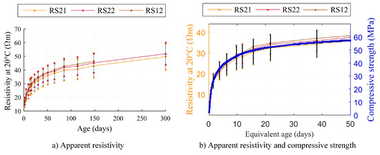 As shown in Figure 20b, there is a strong correlation between resistivity and compressive strength evolution. The resistivity of concrete is dependent on many factors, e.g., pore structure, pore solution, temperature and degree of water saturation. However, for a given concrete (same chemical composition), whose degree of saturation remains stable and after a correction of thermal variation on measurement, the only variable parameter is the porosity. In this study, it is reasonable to consider that the degree of hydration changes only slightly (see the value of RH% always close to 100% during the first year of structure service life). Additionally, it is recognized that the strength of concrete is mainly determined by porosity instead of other factors, e.g., pore solution and water saturation. Since the porosity evolves with hydration [52] thus modifying the resistivity value and the mechanical strength of concrete, the resistivity measurement can be considered as an indicator of material hardening. As a consequence, when the resistivity has reached its asymptotical value, it is probable that compressive strength is close to the maximum.