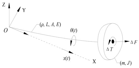 The marine propulsion shaft is simplified and modeled as an Euler cantilever beam with the mass center deviated from the principal axis along the beam, as shown in Figure 1 [19]. As an effect of this slight deviation during the shaft rotation, the torsional distortion produces longitudinal contraction with the excitation of external torque. This longitudinal contraction occurs with the torsional rotation and achieves its largest value with the maximal torsional distortion. The shaft changes to its original length as it returns to the initial position. As the torsional distortion produces longitudinal contraction every cycle motion, the longitudinal vibration is thus induced and coupled out. That is the law of motion and dynamical interaction of the coupled torsional-longitudinal vibrations of the rotational shaft. References [20,21,22] have demonstrated the accuracy of the theoretical analysis for a marine propulsion shaft.
