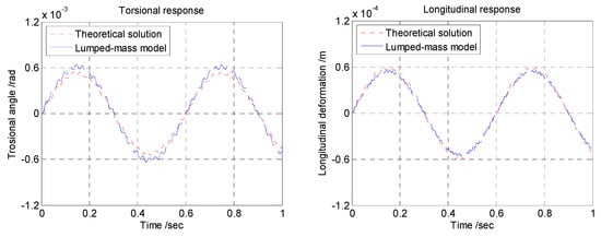 To define the calculation length, the solving time is 1 second to represent the numerical results. The initial state of the shaft is set as and . During the comparison of the proposed lumped-mass model and the theoretical solution, the coupling stiffness coefficient is not considered to maintain consistency. That means that the coupled stiffness is assumed as to analyze the individual torsional and longitudinal vibration responses.