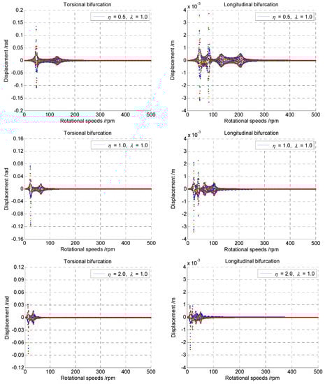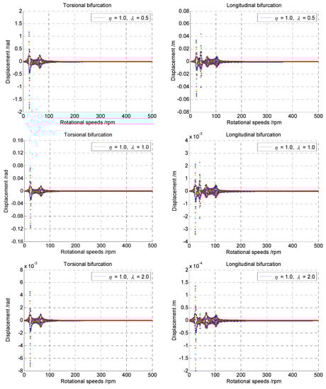 Similarly, the bifurcation diagram of the coupled response with the length ratio and the diameter ratio increasing from 0.5 to 2.0 is shown in Figure 6. The bifurcation seems unchanged with the increasing diameter ratio for the coupled vibrations. It can be concluded that the bifurcation frequencies are independent of the diameter of the shaft. Moreover, the longitudinal bifurcation with shows a smaller peak corresponding to coupled torsional bifurcation. That means that the interaction is still existent for the frequency domain of the coupled vibrations. The bifurcation frequency in the coupled direction should be considered for the minimization of the dynamical response, while the displacement regarding the ordinates at each bifurcation decreases severely with the diameter increasing by several times. This means that the diameter ratio of the shaft determines the transient severity of the coupled vibrations.