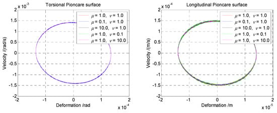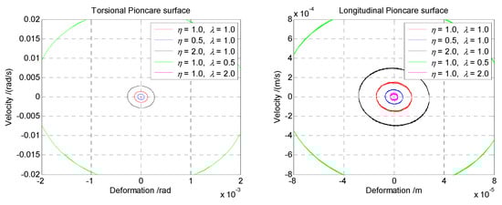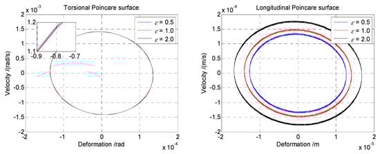 Figure 10 is the Poincare surface of the cross-section of various coupling stiffness coefficient ratios of the coupled torsional-longitudinal vibrations. As the shape of the axial orbits is close to an ellipse, this indicates the existence of an interaction for the coupled vibrations. Specifically, the torsional Poincare surface response is in a nearly steady state according to the discretization between each periodic, especially for the comparison between the case of and . This trend of sectional motion is nearly independent from the coupling stiffness coefficients. However, the longitudinal Poincare surface appears to be a serious variety when the coupling stiffness coefficient increases. The axial orbit of is much larger than that for the case of and then that of . Moreover, this increase for each case of the coupling stiffness coefficient is not a multiple or linear relationship.