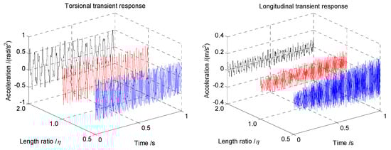 Figure 8 indicates the transient response of the coupled vibrations with various length ratios. It is shown that the torsional accelerations basically remain unchanged with the length ratio ranging from to and then to . However, a slight decrease can still be found with the length ratio increasing. However, the variety in the longitudinal transient response is much more obvious than that of the torsional direction. The longitudinal acceleration decreases several times with a value of nearly the ratio of the shaft length. Thus, a reciprocal relationship regarding the length ratio can be obtained for the shaft length and the longitudinal transient response.