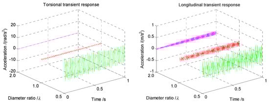 The transient response of the coupled vibrations with increasing diameter ratio is shown in the following Figure 9. It can be found that the coupled accelerations display a huge decline with the shaft diameter increasing several times, and the variety between different cases is significant, especially for the case of . The coupled accelerations are much greater than that of and , as shown in Figure 9. A non-linear relationship for the coupled accelerations and diameter can, thus, be concluded.