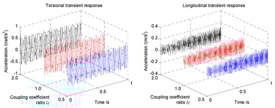 For the transient response with various coupling stiffness coefficients in Figure 11, the acceleration variety basically reduces as the coupling stiffness coefficients increases. That means that the coupling stiffness coefficient has little influence on the transient accelerations of the coupled vibrations. However, the behavior indicates a slight increase with the coupling stiffness coefficients range from to based on the comparison. It should be pointed out that the transient response of torsional direction changes slightly, while the longitudinal curves show an obvious variety with increasing coupling stiffness coefficients. Therefore, the coupling stiffness coefficients should be considered in the incipient design process for the shaft.