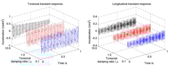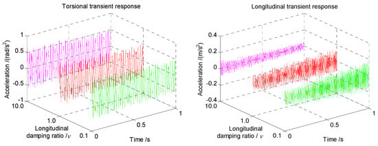 Figure 13 and Figure 14 are the comparison of the transient response with various torsional and longitudinal damping coefficients, respectively. For the case of torsional damping ratio, the coupled accelerations show a slight decrease in torsional direction and unchanged curves for the longitudinal acceleration. Similarly, for the case of the longitudinal damping ratio, the transient results of the coupled vibrations are nearly unaffected with a slight decrease in longitudinal acceleration. This means that the damping affects the transient response in its direction more obviously than the coupled direction. That is, the torsional damping coefficient affects the torsional response more severely than the longitudinal response, and vice versa. Although the discretization of the defined damping coefficient ratio is not large enough for comparison, this small variety of the transient response can be still noticed from the longitudinal response in Figure 13 and the torsional response in Figure 14, respectively. Hence, the influence of the damping coefficient on the coupled vibrations should not be ignored during the design stage of the shaft.
