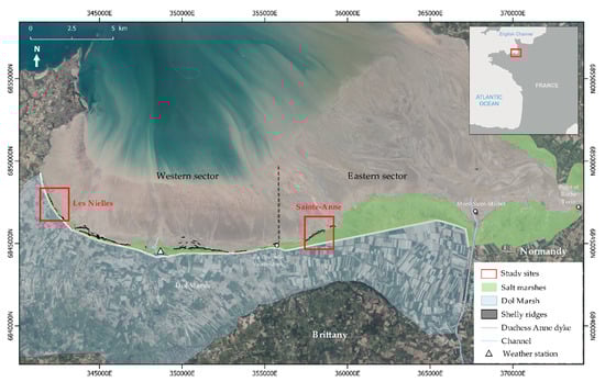 Mury, A.; Jeanson, M.; Collin, A.; James, D.; Etienne, S. High Resolution Shoreline and Shelly Ridge Monitoring over Stormy Winter Events: A Case Study in the Megatidal Bay of Mont-Saint-Michel (France). J. Mar. Sci. Eng. 2019, 7, 97. https://doi.org/10.3390/jmse7040097