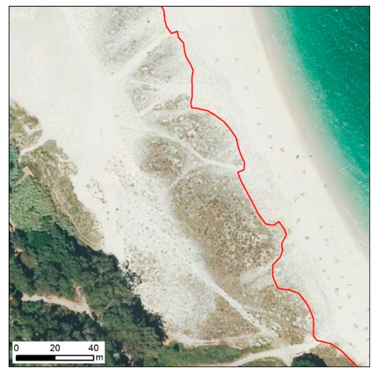 46]. Use of the high-water level as the shoreline was excluded as there are significant differences in the meso-tidal zone, and the images were taken at different times of the year. The dune vegetation line [