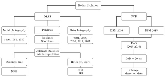 To analyze the variations in the Rodas system, two types of software were used. The DSAS (Digital Shoreline Analysis System) [