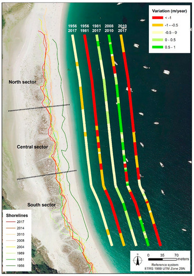 36]. The most important changes in the Rodas system occurred between 1956 and 1981, during which the net retreat exceeded 30 m in the north and south sectors. This led to the appearance of an inlet in the northern part of Rodas that connects the lagoon with the sea during winter storms, while the inlet that formed up until the 1950s in the southern sector disappeared gradually [