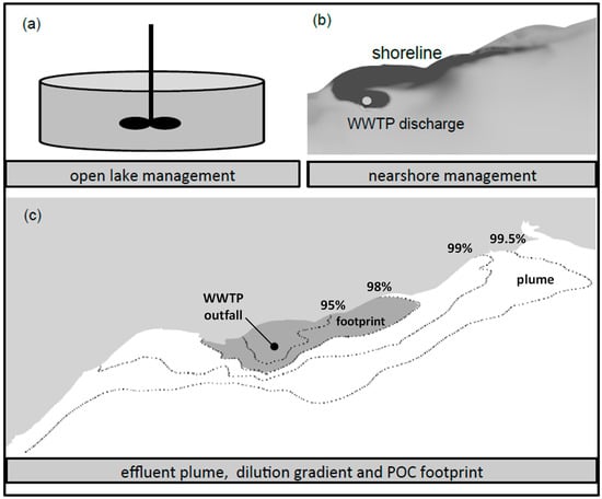 Conceptualization of water quality management in (a) an open lake and (b) a nearshore context, and (c) an effluent plume, over which a dilution gradient (dashed lines) is manifested, as well as the footprint for a pollutant of concern (gray shading). The extent of the plume is set arbitrarily at the 99.5% dilution isopleth and represents the confluence of water containing effluent and the unimpacted boundary condition. The extent of the footprint is set at the 98% dilution isopleth for this example.