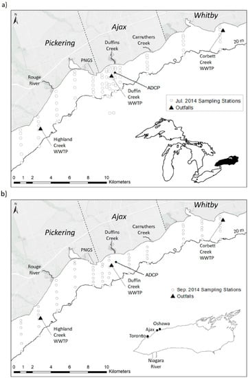 The study site is located along a 25-km stretch of the Lake Ontario nearshore from Pickering to Whitby, ON, centered on Ajax, ON and extending offshore for a distance of ~3 km (4.5 km at two stations; Figure 2). Although positioned near the eastern boundary of the GTA, the study site remains highly developed. Maximum depths range from 20 to 35 m, the approximate point of separation for nearshore and offshore waters in Lake Ontario [] (see also References [,]). Three tributaries (the Rouge River, and Duffins and Carruthers Creeks), three wastewater treatment plants (WWTPs; Highland Creek, Duffin Creek, and Corbett Creek), and the Pickering Nuclear Generating Station (PNGS; cooling water intake and discharge) are located within the study site (Figure 2; Figure 3; Table 1). Based on total phosphorus (TP) load [], the Duffin Creek, Highland Creek, and Corbett Creek WWTPs are, respectively, the second, seventh, and ninth largest of the 38 plants discharging to the Canadian waters of Lake Ontario []. The Pickering Nuclear Generating Station withdrawal and return represents use for once-through cooling water. While this intake and discharge impacts local flow conditions, it has no impact on water quality constituents.