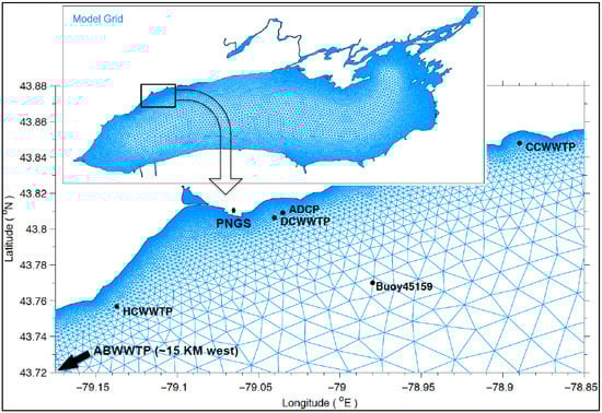 Although this study focuses on the Pickering → Ajax → Whitby nearshore (Figure 2), FVCOM is configured to simulate physical dynamics for all of Lake Ontario in a manner similar to that applied by Xue et al. [], thus providing reliable representation of large-scale background circulation and the role of remote (offshore) forcing in driving nearshore water movement; additionally, this configuration avoids the impact of setting an artificial numerical boundary condition for our target region. The advantage of an unstructured grid is that model resolution varies from 2–4 km (coarse) in the open lake to 50–150 m (fine) in the targeted nearshore, affording a high degree of resolution across the 25-km study site and adequately resolving the geographic complexity and coastal hydrodynamic conditions of that system (Figure 3). The model configuration yields a total of 41,442 grid elements (cells) in the horizontal plane. Vertically, 20 evenly spaced sigma coordinate layers are implemented with a resolution of <1 m in the nearshore region of interest and 5–10 m in the open lake. The bathymetric data used in the hydrodynamic model are derived from a three-arc-second (~90-m cell size), grid-based dataset from https://www.ngdc.noaa.gov/mgg/greatlakes/greatlakes.html. The Great Lakes bathymetric data were compiled by the National Oceanographic and Atmospheric Administration (NOAA) and made available to the public for Great Lakes science.