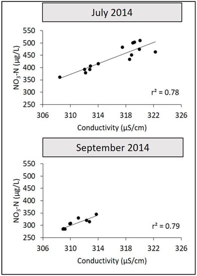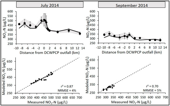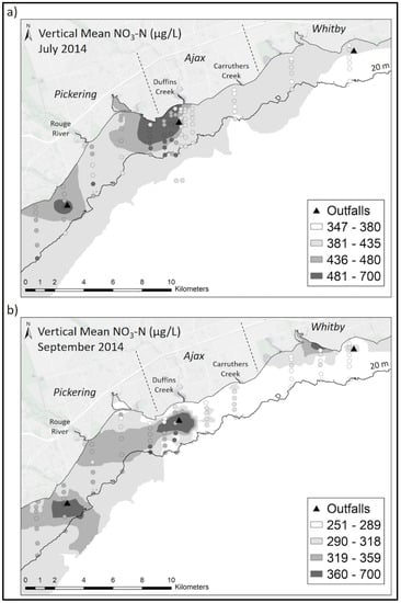 A conservative tracer is required in simulating plume hydrodynamics so that mass transport and kinetic influences on plume distribution may be separated; conductivity is traditionally applied for this purpose. Here, we utilize nitrate (NO3-N) as the tracer due to its degree of enrichment proximate to WWTP outfalls relative to ambient lake water (42% and 23% in July and September 2014, respectively, for nitrate and 5% and 2% in July and September 2014, respectively, for conductivity; Figure 4). Additionally, NO3-N may be considered as approximately conservative over the time interval of measurement used here to characterize plume dimensions. Seasonal surface water nitrate depletion due to phytoplankton nutrient uptake is regularly observed in the Great Lakes [,,,]. The rate of nitrate depletion at the study site, determined from contemporary measurements made on four dates in 2014 (5 June, 6 August, 3 September, and 17 September) by the Toronto and Region Conservation Authority, http://arcgis01.trca.on.ca/nswq/,), was 1.2 µg NO3-N⋅L−1⋅day−1. This rate is comparable to that observed in our measurements (1.6 µg NO3-N⋅L−1⋅d−1 and is <1% of the range in nitrate levels measured in our single day sampling events. The near-conservative nature of nitrate is also evidenced by the linearity of its relationship with paired measurements of conductivity (Figure 4).