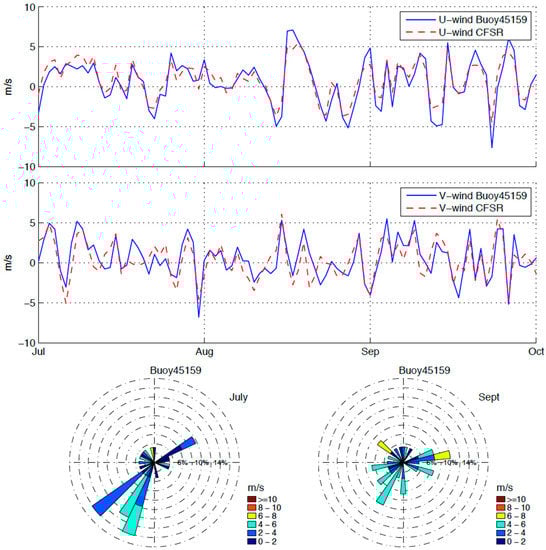 Wind-driven flow plays an important role in governing mass transport in coastal regions. Although the CFSR meteorological forcing used here is considered suitable for lake-wide simulations [], our first step for this study was to ensure that wind conditions measured at a local buoy were consistent with CFSR output for the coastal region of interest. A comparison of eastward and northward wind components at the study site (Figure 5, upper panel) demonstrates that CFSR-derived data are consistent with buoy-measured winds. Notice that buoy winds were measured at the 5-m level, which was adjusted to wind at the 10-m level based on the formula of log wind profile [,],