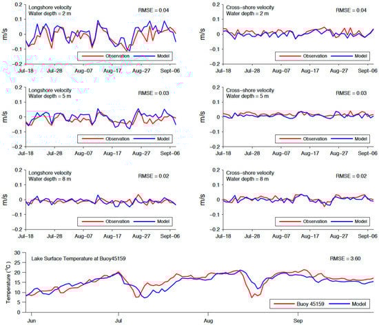 Comparison of model output with ADCP measurements of daily averaged longshore and cross-shore currents at depths of 2 m (near surface), 5 m (middle layer), and 8 m (near bottom). Comparisons of model output and measurements of the daily average lake surface temperature at the NDBC Buoy 45159 location are presented in the bottom panel (only surface water temperature is available at the buoy location).