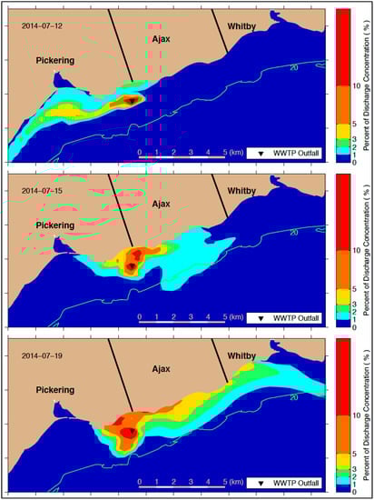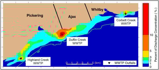 The annual total phosphorus loads for the WWTP effluents received by the study site (Highland Creek, Duffin Creek and Corbett Creek) rank second, seventh, and ninth among the 38 Canadian plants discharging to Lake Ontario, as tabulated for 2008 by Makarewicz et al. []. Unlike tributaries, effluent discharges from WWTPs exhibit relatively constant flows over the year; however, like all discharges to the nearshore, plume position varies dynamically under the influence of coastal jets (Figure 9). WWTP plume dimensions and the interaction of juxtaposed effluent discharges were explored by performing a 13-day FVCOM run (run#6) using the meteorological and mass transport conditions of 9–21 July 2014. WWTP effluent loads were calculated as the product of flow (Table 2) and the conservative tracer concentration (assumed equal to one and identical for each input). Model output is presented as a percentage of the tracer concentration at discharge, thus representing the interplay of discharge rate and ambient mass transport in determining plume distribution (Figure 11).
