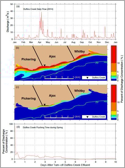Model inputs and results for tributary simulations: (a) Duffin Creek flows for 2014, (b) Duffin Creek plume for high-flow conditions, 4–10 April 2014 (model results are from run#3), (c) Duffin Creek plume for low-flow conditions, 13–19 July 2014 (model results are from run#4), and (d) purging of the Duffins Creek plume from nearshore waters (model results are from run#5).