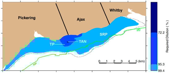 These results, treating POCs as conservative substances to target mass transport processes, indicate that the previously unattended SRP POC will not meet the guidelines for mixing zone-based regulation with current treatment technologies. Since there is a much greater difference between Cstandard and Ceffluent for SRP than for TAN or TP (Equation (3), Table 3), the footprint for SRP is much larger than that for TAN and TP (Figure 12) and a greater reduction in Ceffluent (D = 99.4%) is necessary. These findings confirm, as a first approximation, our hypothesis that a shift in management focus to the Lake Ontario nearshore will reveal a necessity to reassess the impact of POC plumes with respect to regulatory guidelines for coastal waters. To achieve compliance with more stringent standards in nearshore applications, the footprints for previously unattended and emerging POCs may require advanced treatment to maintain compliance in a regulatory context.