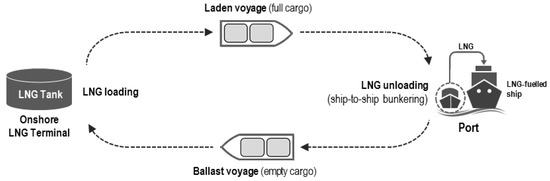 The LNGBV for coastal trades might typically range from 1000 m3 to 20,000 m3 [27]. In this study, the target ship is set to have the storage capacity of 5000 m3 for the receiving vessel, which is located within a short distance of about 27 nm (50 km). Its BOR is set to 0.3%/day for the laden voyage, and 0.08%/day for the ballast voyage considering several references [3,4,14,15,16]. The voyage concept for the target ship is shown in Figure 1.