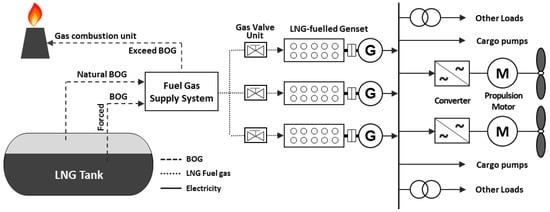 Besides, in this vessel, there are three gensets with 1.5-MW power each to supply electric power for propulsion as well as ship service loads; one or two gensets are sufficient to supply the load demands for all the operation modes, and the last genset is just for redundancy in accordance with the rule requirements [29]. These are all LNG-fueled gensets, so the BOG can be utilized for their fuel. Furthermore, the target ship is applied to the electric propulsion system due to its high station-keeping capability during bunkering operations. Its concept diagram is shown in Figure 2, and the assumed specifications of the target ship are shown in Table 2.