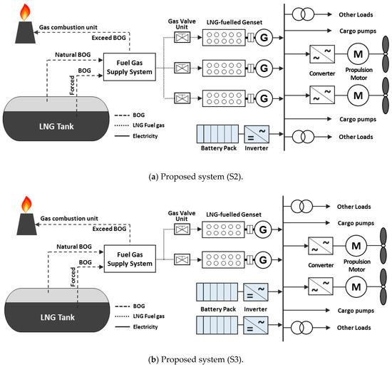 In order to reduce a considerable amount of BOG for the LNGBV, two ESS–hybrid power systems are suggested compared to the conventional system (S1). For the first proposed system (S2), the ESS is installed additionally with the limited capacity that is determined by the volume and weight marine discussed in Section 2. Secondly, the other system (S3) installs a greater capacity of ESS by eliminating one of gensets onboard. In this case, the additional capacity of the ESS is limited to the volume and weight of the one genset being replaced; these limit values are based on several manufacturers’ specifications, as shown in Table 3. The concepts of the proposed systems are described in Figure 3a,b.