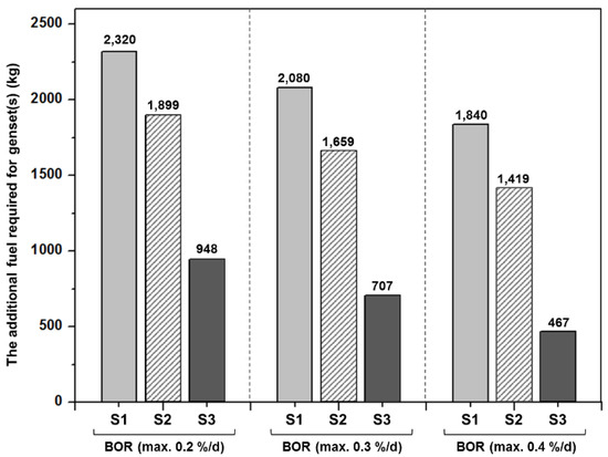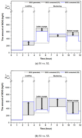 The change of the BOG generated and consumed for the conventional system (S1) and proposed one (S2) are compared in Figure 4a, and between S1 and S3 are compared in Figure 4b. For the S2 and S3 cases, when the amount of BOG is too much, the BOG is consumed additionally by using it for the ESS charging. Therefore, the reduced amount of BOG can be about 117.7 kg/h for LBOG, 83.0 kg/h for BBOG in the case of S2, and 380.0 kg/h for LBOG, 238.3 kg/h for BBOG in the case of S3. If the LBOG and BBOG are assumed to be about 1000 kg/h each, the reduction rate compared with S1 is 15.2% for S2, and 46.2% for S3. In addition, when the amount of BOG is too small, the proposed systems require less LNG fuel by using the stored energy in the ESS. In other words, the fuel shortage of the gensets can be compensated by the ESS. Assuming that the BOR is a minimum of 0.08%/day and a maximum of 0.3%/day, the fuel consumption decreases to 20.2% for the S2 system, and 66.0% for the S3 system compared with the conventional system (S1). In addition, in the case of the higher BOR condition, the fuel reduction rate increases because of the increased amount of BOG (Figure 5).