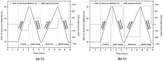 The changes of the power output and state of charge (SoC) of the ESS during one voyage are shown in Figure 6. The SoC is calculated using the MATLAB/Simulink software (MathWorks, Natick, MA, USA) based on the defined specification in Table 4. Figure 6a,b show that the SoC of each ESS is within the allowable operation range of 10% to 90%.