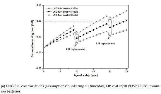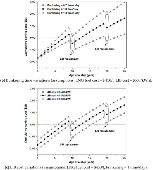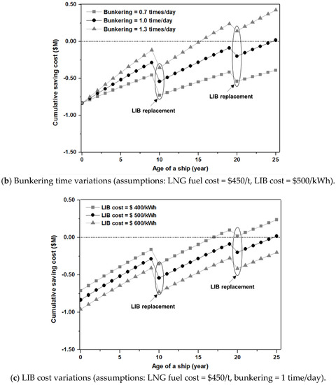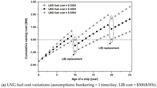 where FS1,2,3 is the fixed O&M cost, and GS1,2,3 is the LNG fuel cost for each system (S1, S2, and S3). Thus, the payback period is calculated by solving for n when the initial investment cost is equal to the sum of the yearly savings. The payback occurs where the curve passes through the zero of the y-axis in the case of the original values. For S2, the payback occurs at around 24.6 years, and for S3, it occurs at around 7.6 years firstly, and then it comes again at around 12.4 years due to the LIB replacement, assuming that the LNG fuel cost is $450/ton, the bunkering time is once a day, and the LIB cost is $500/kWh. In addition, the internal rate of return (IRR) is 5.1% for S2 and 9.1% for S3, which are higher than the assumed interest rate (5%). Therefore, both systems could be acceptable.