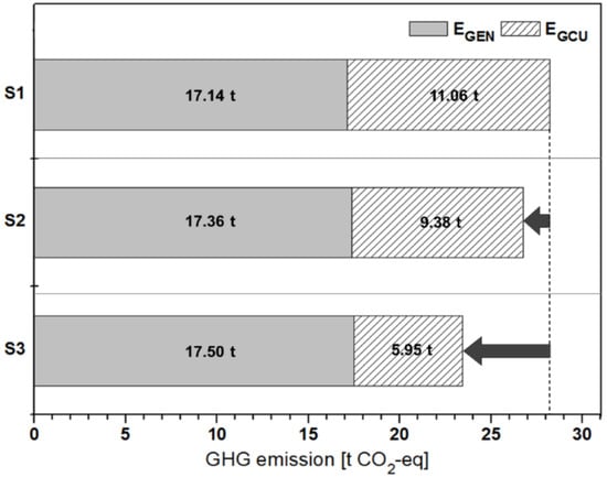 In this study, GHG emissions are categorized into two parts. Firstly, emissions from the GCU (EGCU) are generated through the GCU for the LNG loading or bunkering mode, in that a huge amount of BOG is generated. Secondly, the emission from the genset(s) (EGEN) is emitted by its combustion operations, and which is proportional to its amount of fuel consumption. The amount of GHG emissions from each system is shown in Figure 9 based on Table 6.