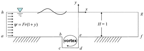 The physical problem is sketched in Figure 1, where the free-surface deformations and vortex evolution during the process of a uniform flow interacting with a cavity are investigated. In the study domain, a two-dimensional (2-D) unsteady viscous flow is assumed. The governing equations, along with the initial and boundary conditions, are described below.