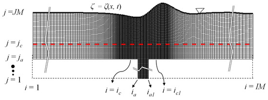 In the numerical method, the algebraic grid-generation technique is adopted for curvilinear grids generated to fit the free surface, as it undergoes deformation. The indices of grid points are denoted by i = 1 to IM within the computational domain (xmin, xmax) and j = 1 to JM within (ymin, ymax) in the x- and y-directions, respectively. The size of the mesh in the x direction is fixed, however, distributed nonuniformly in space. As shown in Figure 2, the domain along the x direction is divided into three regions: the first region extends from i = 1 to i = ic, the second region covers the cavity from i = ic to i = ic1, and the indices from i = ic1 to i = IM are arranged for the third region. However, along the y direction, the domain is divided by the line numbering j = jc into two parts: the lower region measures from j = 1 to j = jc and the upper one extends from j = jc to j = JM. The grid size in y direction below y j c is fixed while in the upper region (above y = y j c ) it is transiently evolved with the varying free surface. In order to generate the numerical grid efficiently, the following non-uniform grid system is adopted: