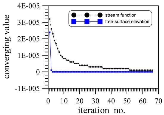 Initially (at t = 0), a still water surface is assumed. The initial values of ζ and ω are zero. Then, the computational grids are generated according to the grid formulations (Equation (16)) and the grid metric coefficients in Equation (5) are determined. Initial values of ψ in the whole flow domain are calculated by solving Equation (2) with the settings of ω = 0, the inlet uniform flow, and other boundary conditions.