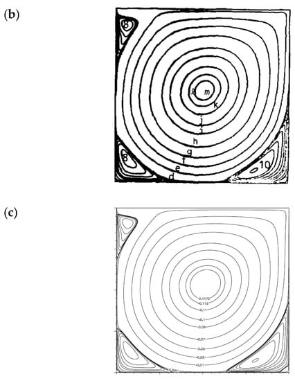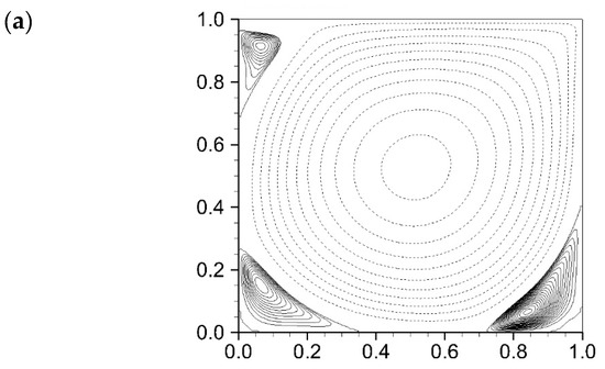 39. Erturk, E.; Corke, T.C.; Gorke, C. Numerical solutions of 2-D steady incompressible driven cavity flow at high Reynolds numbers. Int. J. Numer. Meth. Fluids 2005, 48, 747–774. [Google Scholar] [CrossRef]