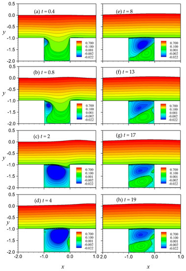 In the past, the viscous effect has often been ignored in water wave studies, including those described on wave generation. It appears that the first numerical calculation considering the fluid viscosity for solving the soliton radiation problem was carried out by Chang and Tang [27]. Only a smooth bottom hump was considered, and hence, no vortex wake was found in their simulated results. Zhang and Chwang [28] numerically solved the Navier–Stokes equations to study the transcritical flow passing through a submerged semi-elliptical cylinder. They showed that the vorticities were transported and diffused around the body, but no obvious vortex wake appeared behind the streamlined body. Later, Lo and Yang [29], adopted the vorticity-velocity formulations in calculating the flow passing over a blunt body and indicated that the vortices were clearly observed on the leeside of the body. Employed the stream-function–vorticity formulations with a free surface (SVFS) model—extended from a model developed by Tang and Chang [30]; Chang et al. [31] investigated the vortex patterns generated by a near-critical flow passing over a small square hump at the bottom.