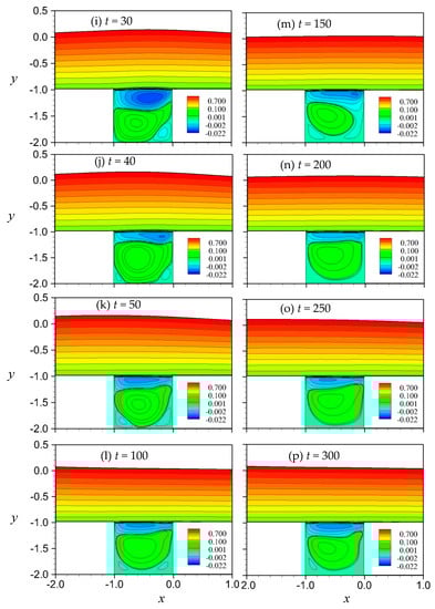 Figure 9. Streamline patterns in a square cavity for Re = 5000 and Fr = 1.0 at various phases: (a) t = 0.4, (b) t = 0.8, (c) t = 2, (d) t = 4, (e) t = 8, (f) t = 13, (g) t = 17, (h) t = 19, (i) t = 30, (j) t = 40, (k) t = 50, (l) t = 100, (m) t = 150, (n) t = 200, (o) t = 250, and (p) t = 300.
