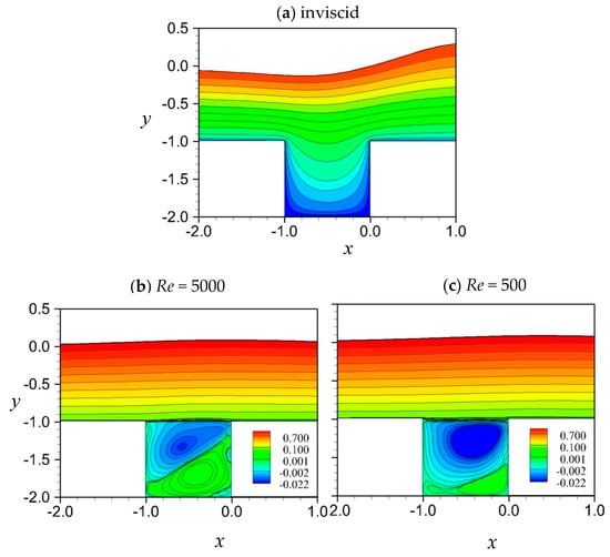Figure 11. Streamlines for Fr = 1.0 at t = 12: (a) inviscid flow, (b) Re = 5000, and (c) Re = 500.