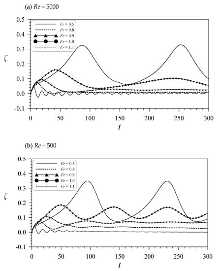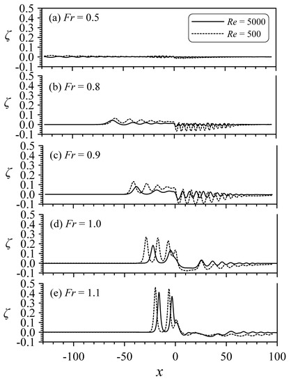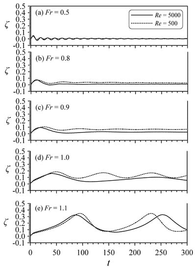 Figure 13. Time varying free-surface elevations at x = −0.5 for Re = 5000, 500, and at various Fr: (a) Fr = 0.5, (b) Fr = 0.8, (c) Fr = 0.9, (d) Fr = 1.0, and (e) Fr = 1.1.