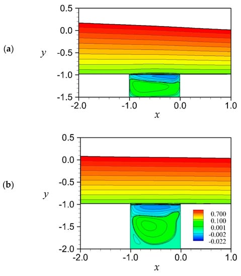 Figure 16. Streamline patterns in a cavity for Re = 5000 and Fr = 1.0 at t = 300 (quasi- steady phase) with cavity size (a) 1.0 × 0.5, and (b) 1.0 × 1.0.