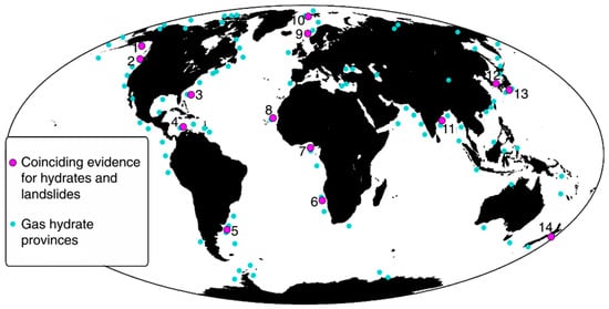 Global compilation of large submarine landslides in areas with gas hydrates [8].