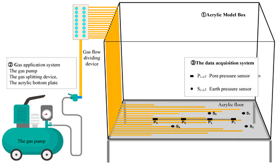 The thickness of the seabed was controlled by the volume of soil. The slope of the seabed was controlled using a jack placed under the model box. To prevent direct disturbance of the bottom sedimentary soil by the gas, a layer of sandy soil with high permeability was deposited on the bottom plate of the gas application system up to a thickness of 2 cm.