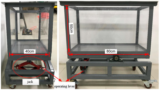 The acrylic model box consists of a polymethyl methacrylate (pmma) sink and a tiltable bracket. As shown in Figure 3, the dimensions of the pmma sink are 80 cm (L) × 40 cm (W) × 50 cm (H) and the thickness of the glass is 2 cm. The tiltable bracket controls the tilt angle of the sink, which can be adjusted from 0° to 25°, simulating the seabed slope at different angles.